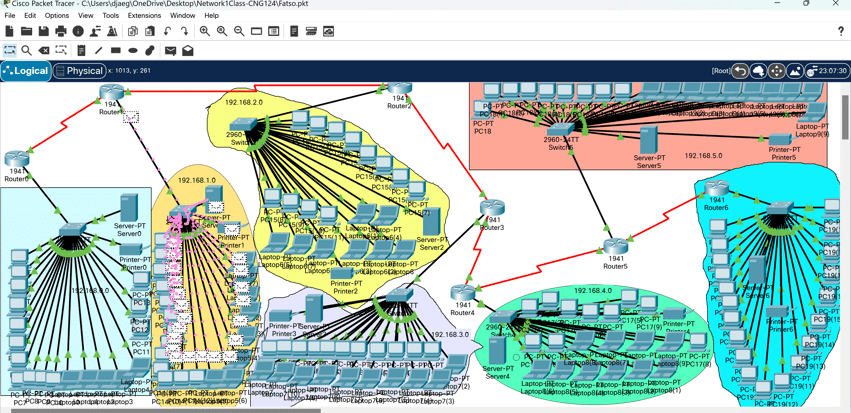 Using Cisco Packet Tracer, I constructed a small network consisting of six different subnets. In each subnet there is a Cisco 2960 switch, 1941 router, a server with static assigned IP addresses, and 21 devices consisting of PC's, laptops, and printers. All devices in each subnet are configured with DHCP, and can successfully receive their IP address from one primary DHCP issuing server in the subnet of 192.168.0.0, as well as successfully ping every device in the network. Additionally, the network has one primary DNS server living on the 192.168.6.0 subnet. Needless to say, I thoroughly enjoyed building this network!